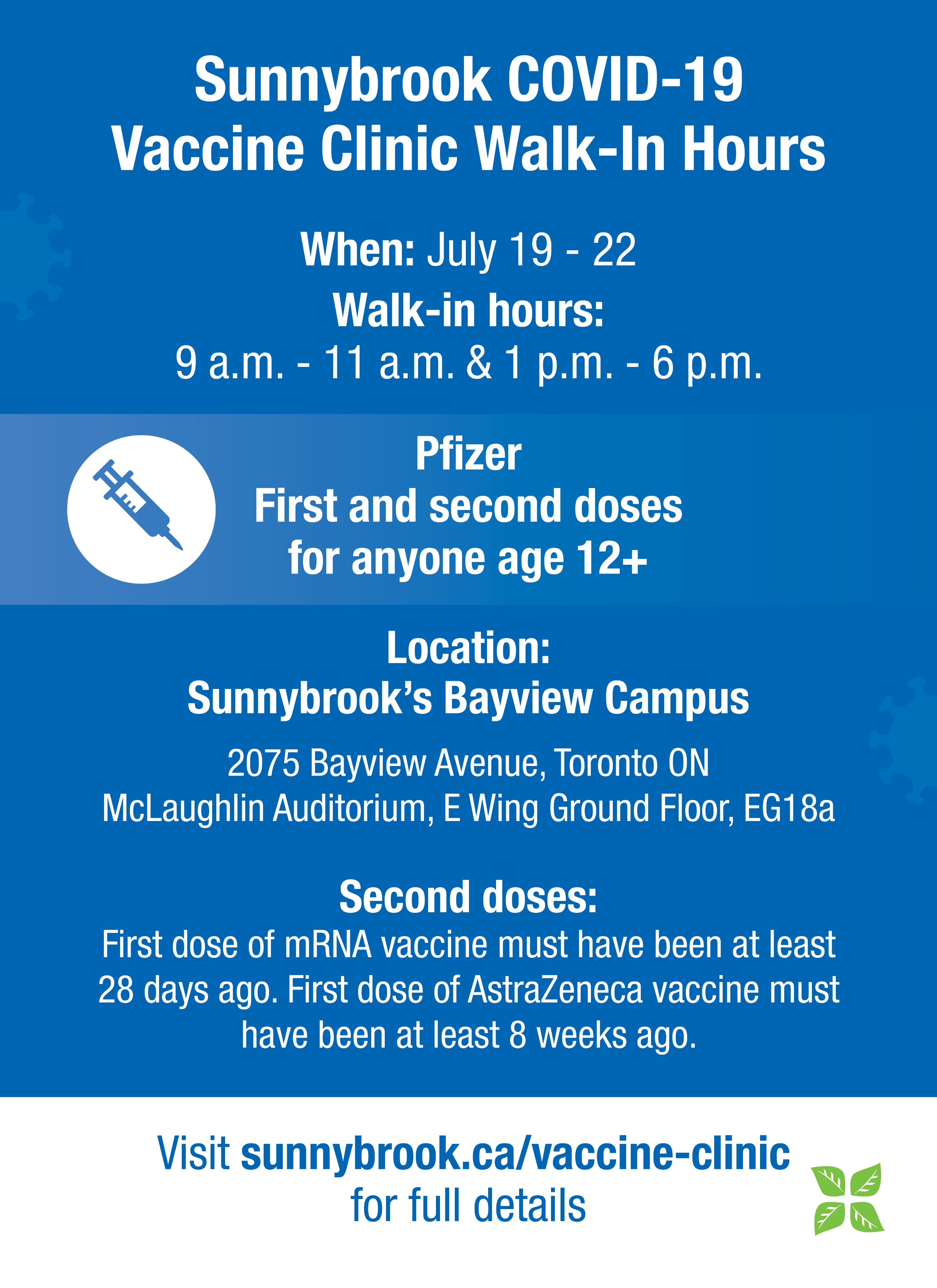 Sunnybrook Health Sciences Centre On Twitter We Are Hosting Walk In Hours At Our Covid 19 Vaccine Clinic July 19 22 For First And Second Doses We Are Offering Pfizer To All Eligible Groups